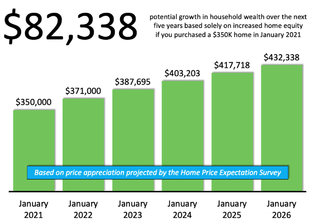 The financial benefits of buying a home as compared to renting one are always up for debate. However, one element of the equation is often ignored – the ability to build wealth as a homeowner. Most experts are calling for home prices to continue appreciating over the next several years. The most recent Home Price Expectation Survey, a survey of over one hundred economists, real estate experts, and investment and market strategists, expects home appreciation to increase as follows: